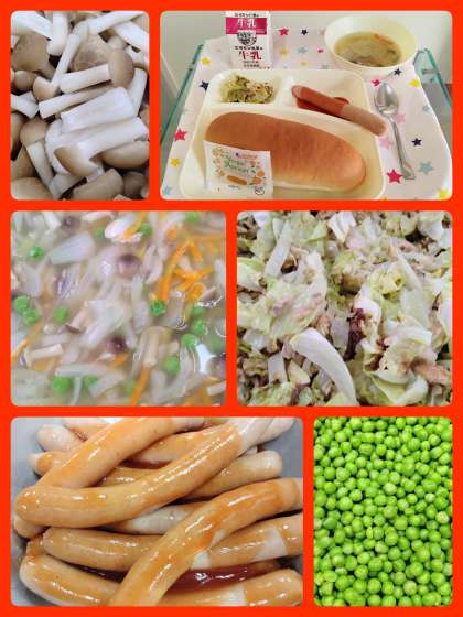 ウインナーのケチャップソース スープ やきツナキャベツ コッペパン アプリコットジャム 牛乳