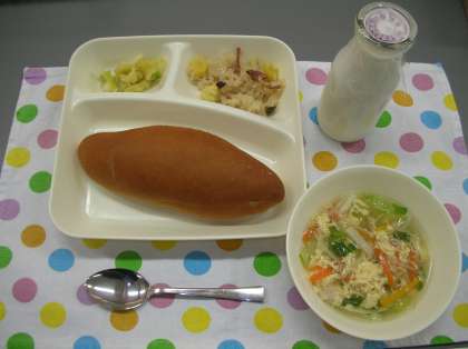 パンと「おこわ」の組み合わせには違和感があるかもしれませんが、子どもたちには人気がありました。最近は、ごはんよりパンをスープにつけながら食べる方が好きな児童が増えてきているようです。パンはスープにつけるとやわらかくなるのですが、しっかり噛みながら食べてほしいと思います。(栄養教諭)