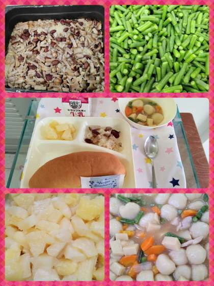 『金時豆の中華おこわ』は、もちもちのもち米に、ほくほくの金時豆としめじを混ぜ込んだおこわです。『まる天と野菜のうま煮』は、まる天、鶏肉、食感のよいたけのこ、彩のよいさんどまめなど使用し、しょうがを少しきかせた中華風味の煮ものです。デザートに甘くてジューシーな『パインアップル(カット缶)』がつきました。