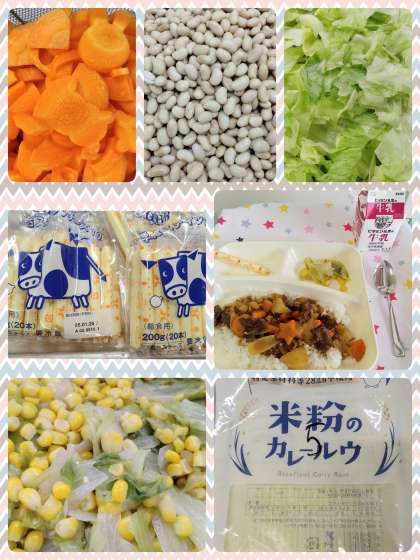 牛肉と大豆のカレーライス レタスとコーンのサラダ 棒チーズ ごはん 牛乳