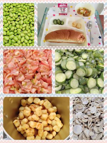 『いかてんぷら』は、外はサクサク中はふっくらとした食感で児童に人気の一品です。『フレッシュトマトのスープ煮』は、鶏肉、じゃがいも、玉ねぎ、にんじん、むきえだまめ、マッシュルーム、旬の生のトマトをたっぷり使用した具だくさんのスープ煮です。おさつパンといっしょに美味しく頂きました。