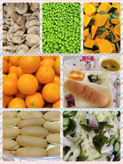 『鶏肉とかぼちゃのシチュー』は、ホクホクの旬の生かぼちゃがたっぷりはいった児童に人気のシチューです。『ミックス海そうのサラダ』は、彩り豊かなミックス海そうを使用した、磯の香りが広がるサラダです。今日のデザートは、ビタミンCが豊富で甘くてジューシーな『オレンジ』です。