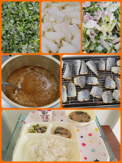 『さごしのおろしじょうゆかけ』は、脂ののったさごしに、たっぷりのおろしじょうゆをかけています。魚の苦手な児童も食べやすい味つけになっています。『野菜いため』は、栄養が豊富な豚肉、甘みのあるキャベツ、彩のよいピーマンをいため塩、薄口しょう油で味つけした、いためものです。具だくさんのみそ汁といっしょに美味しく頂きました。