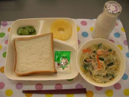 今日は、給食室に給食を取りに来ると「『パインアップル』って何?」ときく子どもがたくさんいました。「パイナップル」と同じものだと気付くと「なんや〜。」と残念そうでした。「松=パイン」の形に似ているからこの名前がつきました。「パイン」を意識すると「パインアップル」という呼び名になるのですが、どちらも同じものです。今日のパインアップルは沖縄県でとれたもので作りました。(栄養教諭)