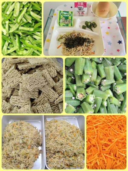 『和風焼きそば』は、豚肉を主材にした、しょう油味の焼きそばです。食べる時にきざみのりをかけて食べます。『オクラのかつお梅風味』は、蒸した旬のオクラにかつおぶし、梅肉、砂糖、米酢、うすくちしょう油で作ったタレをかけあえています。さっぱりとした甘酸っぱさで美味しかったです。