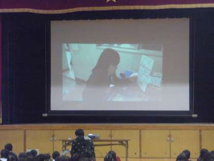 今日の(12日)児童集会は、放送委員会の発表でした。委員会が、普段どのような活動をしているのか、動画を使って紹介しました。また、放送の合図があった時は、静かに聞いてくださいと呼びかけました。