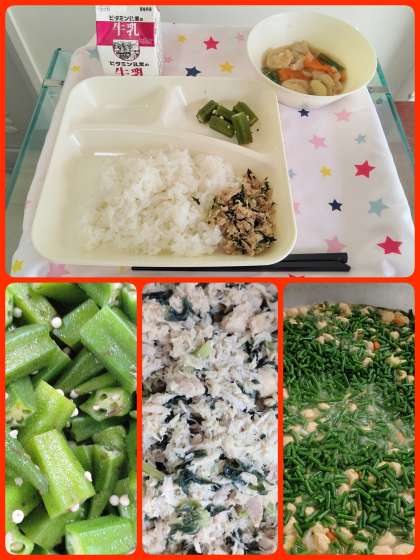 『オクラの梅風味』は、さっぱりとした梅の酸味とオクラのネバネバ食感が組み合わさり爽やかな味わいです。『ツナっ葉いため』は、ツナとだいこん葉をいため味付けしています。喫食時にごはんにかけていただきます。『鶏肉と一口がんもの煮物』ともよく合い美味しかったです。