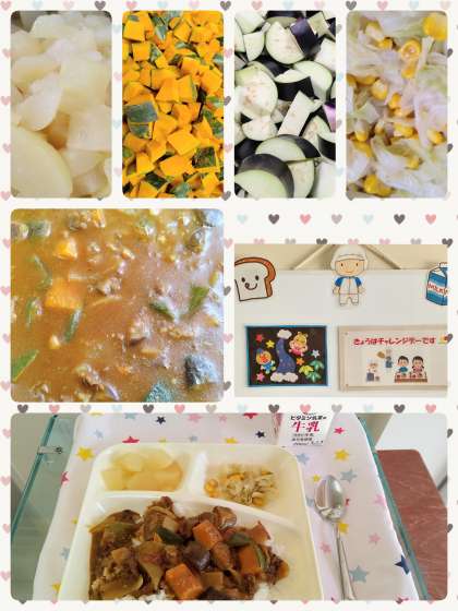 『夏野菜のカレーライス』は、かぼちゃ、なす、ピーマン、トマト、セロリなど夏が旬の美味しい野菜をたくさん使用したカレーライスです。今日のデザートは、甘くてやわらかい『洋なし(カット缶)』がでました。今日は、チャレンジデーです。みんなで完食を目指しました。