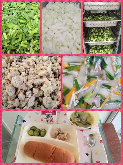 外はサクサク、中はジューシーにあがった『鶏肉のからあげ』は、児童に人気の献立です。『ハムととうがんの中華スープ』は、ハムを主材に、とうがん、玉ねぎ、にんじん、えのきたけ、にらを使用したスープです。とうがんは、漢字で「冬瓜」と書きますが夏が旬です。水分がたくさん含まれていて、体をクールダウンする働きがあります。