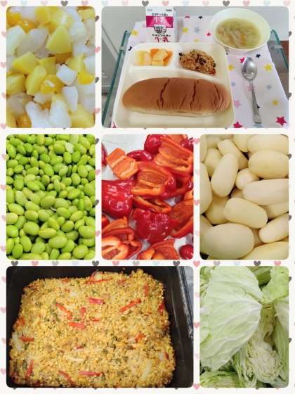 今日は、1学期最後の給食です。給食調理員さんに感謝の気持ちを込めていただきました。『押麦のチキンパエリア』は、鶏肉、旬の赤ピーマンなどの野菜をオリーブ油でいため、押麦などを使用したパエリアです。ピーマンの赤色、さんどまめの緑色、カレー粉の黄色で彩りのよい献立です。『ウインナーとキャベツのスープ』は、野菜の味わいが優しい具だくさんのスープです。パンによく合う献立で美味しかったです。