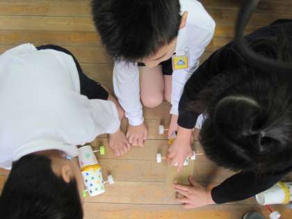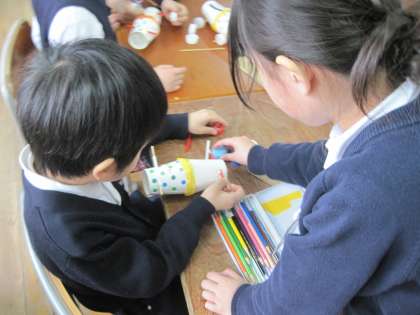2年生が『おもちゃ教室』を開きました。1年生を招待して、熱心に作り方の説明をしていました。上手な話し方に、1年生も真剣に話を聞き、一緒に楽しく手作りおもちゃで楽しむことができていました。
