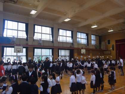 今朝(22日)は、今年度はじめての児童集会を行いました。先日編成したたてわり班で、講堂に集合しました。1回目の今日は、集会委員会によるゲーム「じゃんけん列車」をしました。違う学年の子を見つけてじゃんけんをし、どんどんつながっていくゲームです。1年生も楽しそうに参加していました。