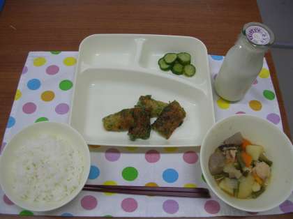 「ちくわのいそべあげ」は、水と小麦粉と青のりで衣をつくり、ちくわにつけて油であげました。いそべあげの「いそ」は、海岸の石の多いところのことで、そこでたくさんとれる「のり」を使って作った料理なので「いそべあげ」という名前がついています。1人4個ずつでしたが、子どもたちには「もっと食べたい。」と言われるほど好評でした。