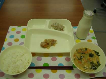 今日の「キャベツの赤じそあえ」に使っている『赤じそ』は、塩漬けした赤じそを乾燥させてものです。「赤しそ」は、日本で育てられた赤しそを使って作られています。出来上がりの色合いは、赤じそ、砂糖、うす口しょうゆで作ったたれをキャベツにかけているせいか、鮮やかな色にはなりませんでした。(栄養教諭)
