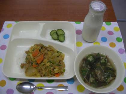 「もずくとオクラのとろり汁」は、だしこんぶとけずりぶしで出汁をとり、もずくやえのきたけ、オクラなど煮ると「とろみ」が出る具材が入りました。子どもたちは、とろみは平気でしたが、「もずくの黒っぽい色がきらい。」という子がたくさんいました。食べるとおいしいのはわかっているようですが、「目で見ると食べにくい。」と言いながら食べていました。今日のもずくは沖縄県産です。(栄養教諭)