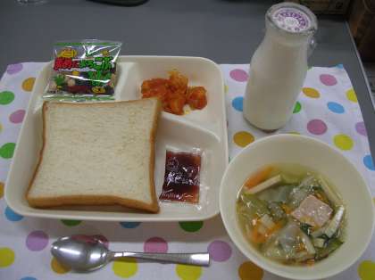 「えびのチリソース」はえびを衣をつけるところから給食室で作っています。えびは、塩、こしょう、料理酒で下味をつけ、でんぷん(片栗粉)をまぶし油であげました。チリソースは、サラダ油でみじん切りしたしょうが、にんにく、トウバンジャンをいため、さらにたまねぎをいためます。いたまれば、砂糖、こい口しょうゆ、ケチャップで味付けして、最後にあげたえびをくわえていためています。手が込んでいて作るのは大変でしたが、とてもおいしく、子どもたちはよく食べていました。(栄養教諭)