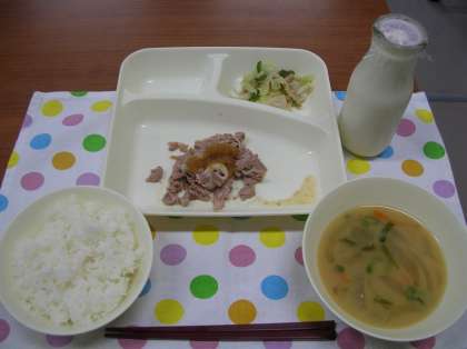 ジメジメとした暑い日が続いていますね。焼いた豚肉に「おろしじょうゆ」をかけると、さっぱりして食べやすくなります。学校の給食の「おろしじょうゆ」は、だいこんおろしにみりん、こい口しょうゆ、ゆず果汁を加え煮て作っています。お魚にもお肉にもよく合います。ゆず果汁は旬ではありませんので、びんに入ったものを使っています。(栄養教諭)