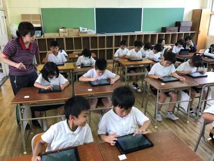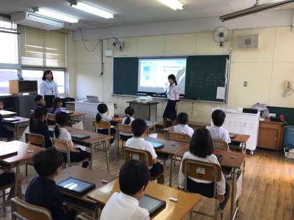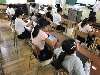 福島小学校にも、今年度からタブレットが入り、2学期からはインターネットにつながるようになりました。そこで、今日(11日)は、ICT支援員(ICT機器の操作等を指導・支援してくださる講師)方に来ていただき、いくつかの学級でタブレットを使っての学習を行いました。