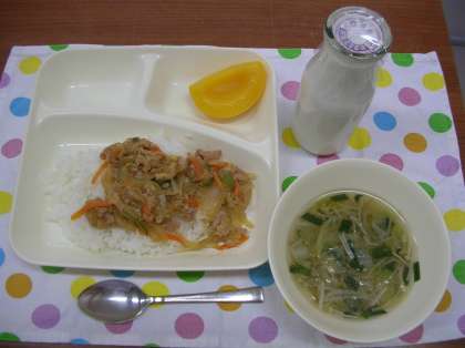 「ピリ辛丼」は、ごはんが食べやすい献立でした。「しょうが」や「にんにく」がきいていて、野菜もたっぷり入っている丼でした。今日の献立に野菜は7種類、130g使いました。