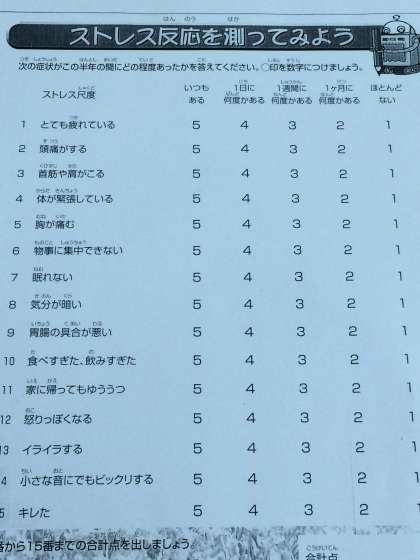 まず自分のストレスチェックをしました。ストレスのメカニズム、コーピング(対処法)、リラクゼーションの体験をおこないました。