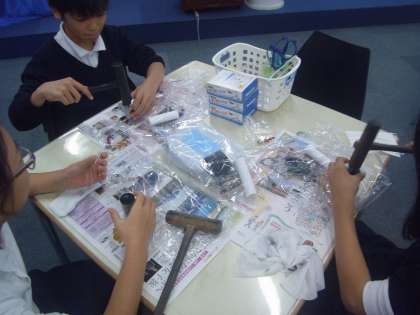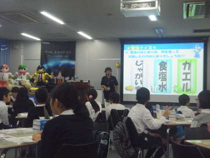 前半は、乾電池についての学習とオリジナル乾電池作りを体験しました。作った乾電池は豆電球を光らせることができ、みんなで点灯式をしました。