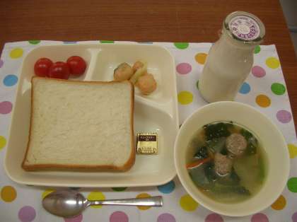 「押し麦」はあまり使わない食材ですね。スープに入れるといろいろな具材から出てくるおいしい味をすって、さらにおいしくなります。煮る時間を調節すれば、歯ごたえのよい具になり、長い時間おいておけば雑炊のようになります。是非お試しください。押し麦はスーパーマーケットのお米売り場に置いてあります。(栄養教諭)