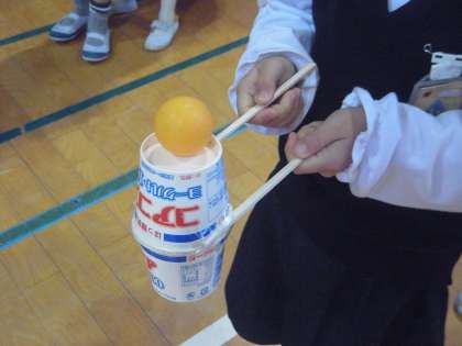 今朝(13日)の集会では、3学期最初の児童集会をおこないました。集会委員会手作りの道具を使って、ピンポン玉運びゲームをしました。たてわり班対抗です。カップから玉が落ちないよう気を付けながら、はや足で運んでいました。みんな楽しくゲームに参加していました。