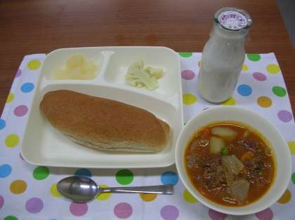 ビーフシチューは、ルゥを給食室で手作りしました。給食室は小麦粉をいためた香ばしいにおいがしていました。子どもたちに好評でした。