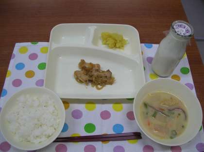 かす汁は、酒かすを入れた具だくさんの汁ものです。酒かすの働きで体が温まります。今日の給食のかす汁は、さけやこんにゃく、だいこん、青ねぎなどを入れました。酒かすだけでなく、白みそ、赤みそ、塩も入れています。「お家のと違う。」と言う子どもがいました。アルコールに敏感な児童にも配慮して、酒かすは少な目に使っています。それでも体は温まったように感じました。(栄養教諭)