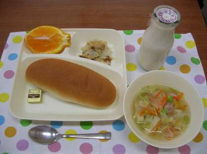 押し麦のグラタン、スープ、デコポン、コッペパン(バター)、牛乳