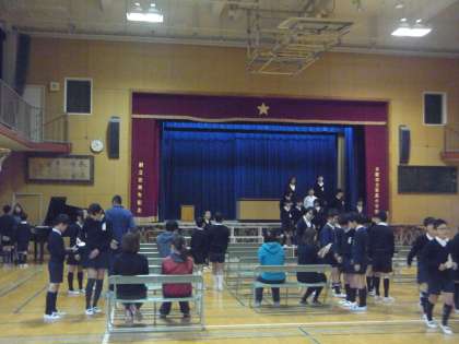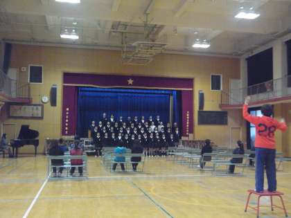 今日(21日)の20分休み、6年生から教職員へ、「歌のプレゼント」がありました。卒業の思い出に、心を込めて何かプレゼントをしたいと、みんなで話し合い「歌を贈ろう」ということになったそうです。「ふるさと」「風になりたい」の2曲を素敵な歌声で歌ってくれました。みんな笑顔でリズムにのった、楽しく心温まる歌でした。