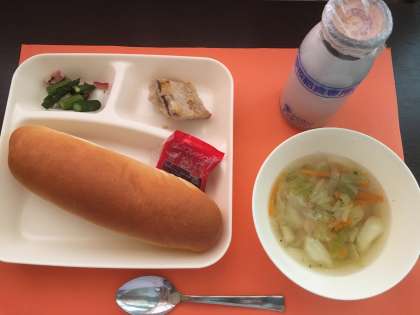 かつおのガーリックマヨネーズ焼き スープ グリーンアスパラガスのソテー 大型コッペパン イチゴジャム