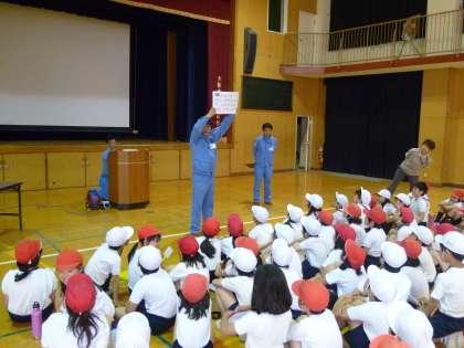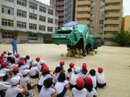 今日の2,3時間目に、パッカー車体験をしました。最初の1時間は、作業員さんの楽しい劇を見たり、グループ対抗の分別クイズをしたり、ごみについて楽しく学習できました。