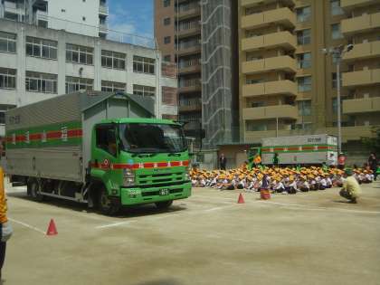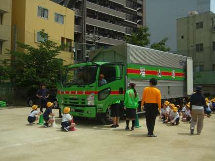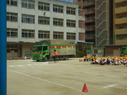 道路への飛び出しがどんなに危険かを、トラックを使って実演していただきました。また、歩行時や自転車乗車時の注意点なども、具体的に教えていただきました。最後には、トラックの運転席に座らせていただき、「車のまわりには、運転者から見えない範囲が多くあること」を体験で知ることができました。