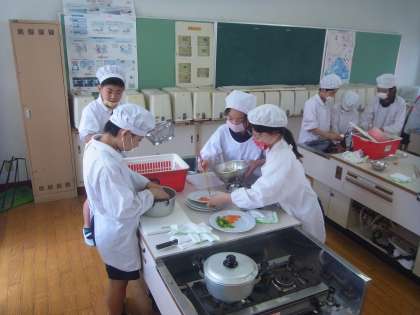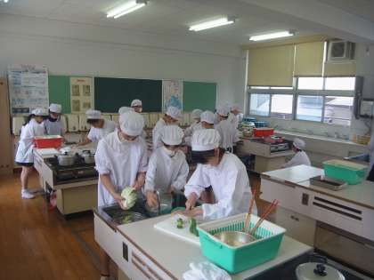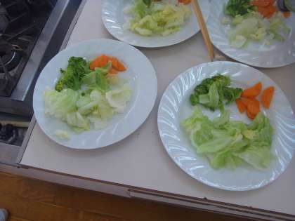 5年生は、今日(1日)と明日(2日)で調理実習をします。今日は、1組が行いました。キャベツやにんじん、ブロッコリーなどを使って、「ゆで野菜サラダ」を作りました。食べやすい大きさに切ったり、湯加減を見ながらゆでたり。グループで協力して活動していました。出来上がった食材は、いろどりを考えて盛り付けしていました。