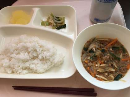 マーボーはるさめ チンゲンサイともやしの甘酢あえ りんご(缶)ごはん 牛乳
