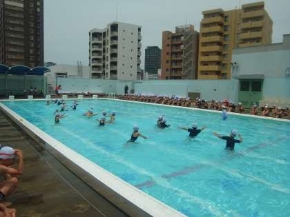昨日の雨がやみ、今日(26日)は朝から良い天気になりましたので、低学年と高学年がプール開きを行いました。