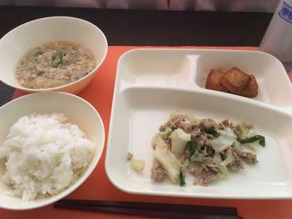 豚肉と野菜のいためもの かきたま汁 あつあげのみそだれかけ ごはん 牛乳