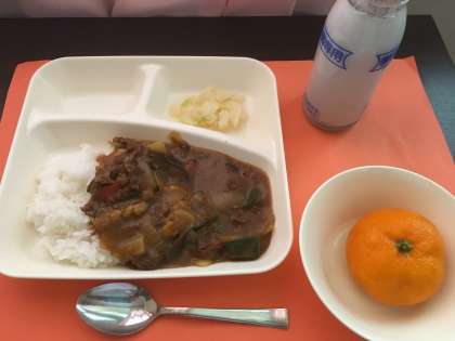 夏野菜のカレーライス、キャベツのサラダ、冷凍みかん、牛乳