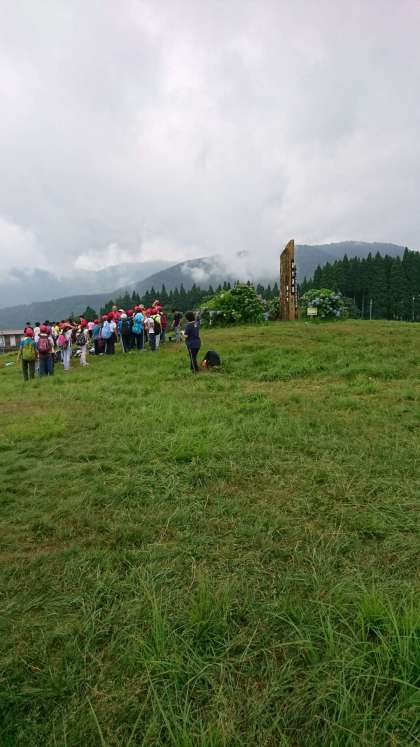 体育館での活動を終え、高原散策へ。モニュメントまでやって来ました。クラスごとに記念撮影です。