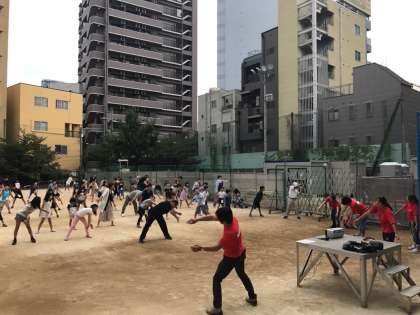 眠たそうにあくびをしながら登校している児童や、元気いっぱいに挨拶しながら登校している児童がいました。PTA会長と地域の連合会長の朝のあいさつの後、子どもも大人も元気いっぱいにラジオ体操をしました。