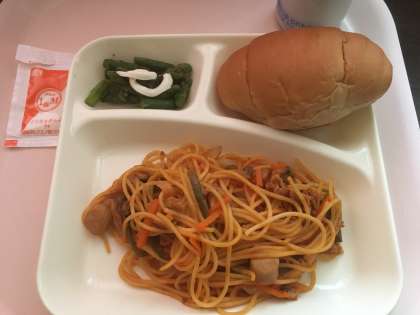 イタリアンスパゲッティ グリ−ンアスパラガスのサラダ ノンエッグドレッシング 1/2黒糖パン 牛乳