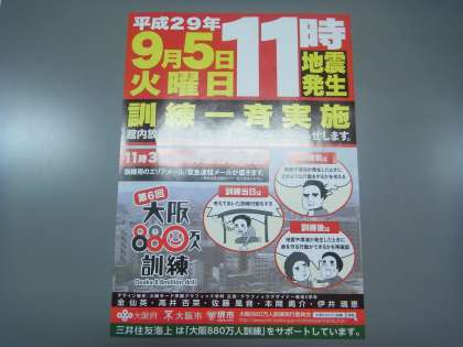 昨日は、「大阪880万人訓練」に合わせて、避難訓練を行いました。地震発生の訓練情報の後、大津波警報発表の訓練情報もありました。担任の先生の携帯電話で、訓練用のエリアメール・緊急速報メールを確認しました。