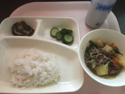 肉じゃが 焼きナスのみそだれかけ あっさりきゅうり ごはん 牛乳