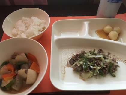 鶏肉と里芋の煮物 牛肉と野菜のいためもの みたらしだんご ごはん 牛乳