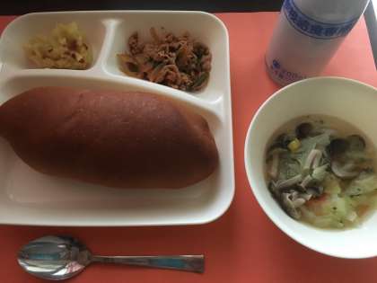 豚肉と野菜のケチャップソテー スープ スイートポテト 黒糖パン 牛乳