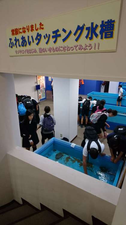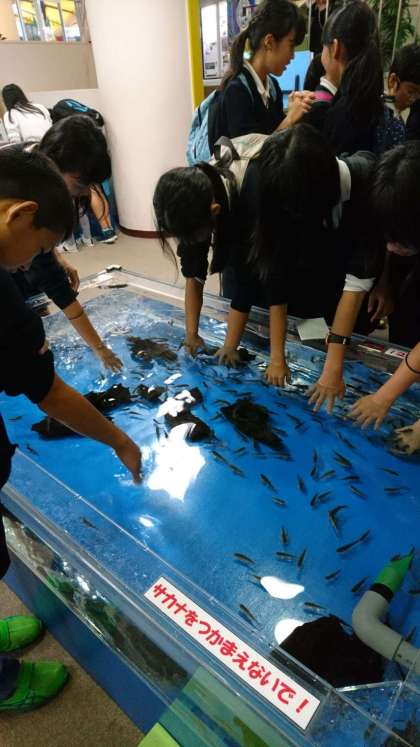 館内の見学をしています。ふれあい水槽では、生き物に触ることができました。