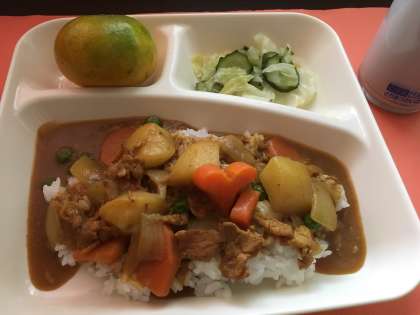 小麦粉を使わず、米粉で作った「ポークカレーライス」は大好評で、初物のみかんも甘くておいしく、完食に終わることができました。ハート形のラッキー人参も子どもたちの楽しみのひとつです。