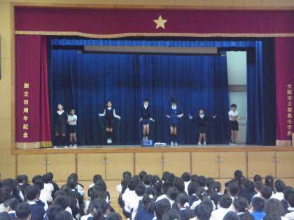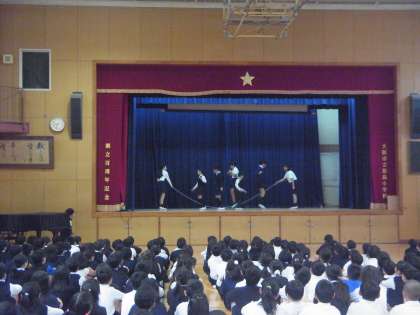 今朝(20日)の児童集会は、運動委員会の発表でした。委員会の役割の説明と、来月行う「なわとび運動」について、いろいろな跳び方の紹介をしました。今日まで委員会の時間や休み時間に練習を重ねていました。今日の発表では、みんなが「挑戦してみたい!」と思うような、じょうずな見本を示すことができていました。