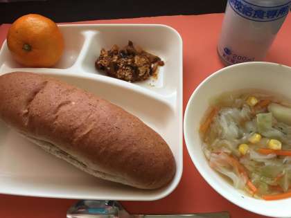 なすのミートグラタン 鶏肉と野菜のスープ みかん ライ麦パン 牛乳